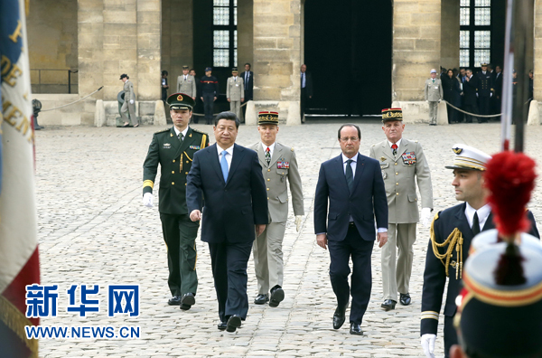????會談前,奧朗德在榮軍院廣場為習近平舉行隆重歡迎儀式。當習近平和夫人彭麗媛抵達時,受到奧朗德熱情迎接。在嘹亮的進行曲中,兩國元首步入廣場。軍樂隊高奏中法兩國國歌。兩國元首檢閱共和國衛隊和三軍儀仗隊。隨后,兩國元首來到廣場中央,觀看分列式。習近平向奧朗德介紹中方主要官員,并同法方主要官員握手問候。