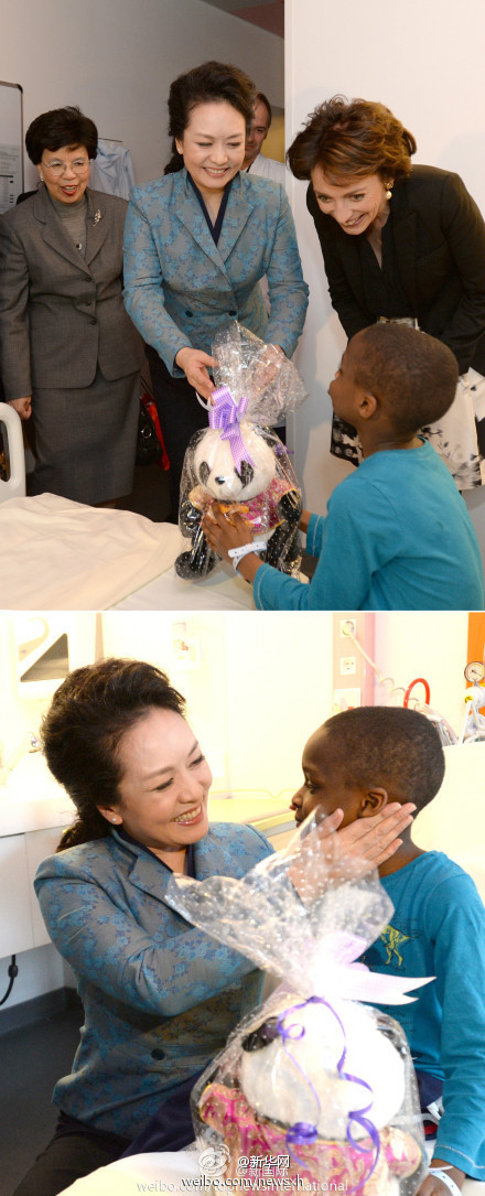 ???? 彭麗媛走進(jìn)哮喘病患兒毛蘇的病房,向他贈(zèng)送了可愛的熊貓玩具。臨別,毛蘇想擁抱一下她,彭麗媛立刻蹲下身,撫摸著毛蘇可愛的小臉蛋,把他擁在懷里,毛蘇高興地親吻了彭麗媛的臉頰。