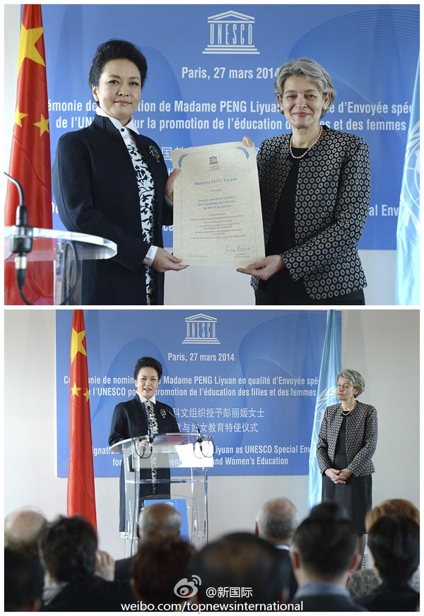 彭麗媛被教科文組織授予"促進女童和婦女教育特使"稱號