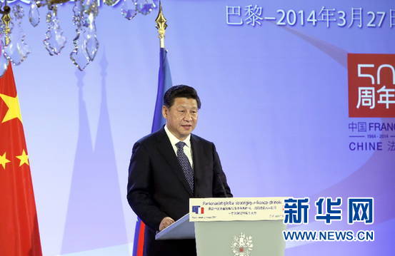 ????新華網(wǎng)巴黎3月27日電(記者李斌 劉華)中法建交50周年紀(jì)念大會27日在巴黎舉行。國家主席習(xí)近平和法國總統(tǒng)奧朗德共同出席并發(fā)表重要講話。習(xí)近平總結(jié)中法關(guān)系50年來的成功經(jīng)驗(yàn),闡述對兩國關(guān)系發(fā)展的政策主張,希望中法兩國人民在實(shí)現(xiàn)中國夢和法國夢的過程中相互理解、相互幫助,共同實(shí)現(xiàn)“中法夢”。