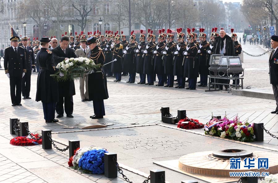 ?3月27日,國家主席習近平在巴黎向法國無名烈士墓獻花圈。新華社記者龐興雷攝