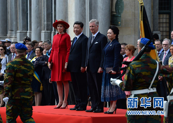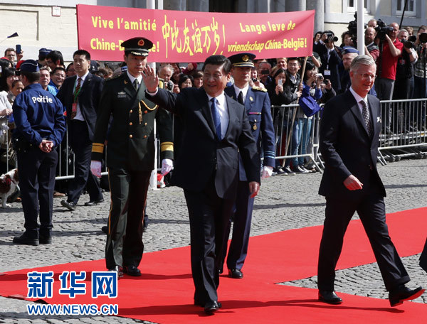 ??? 4月1日,國家主席習近平離開比利時布魯日市啟程回國。離開前,比利時國王菲利普在布魯日廣場為習近平舉行隆重歡送儀式。 新華社記者馬占成攝
