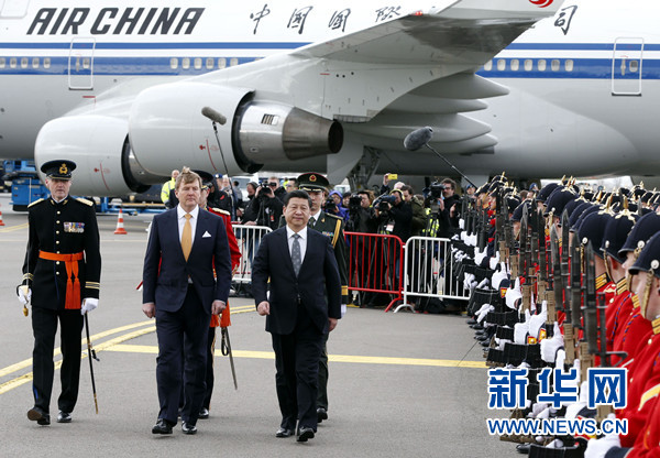 ??? 3月22日,國家主席習近平抵達阿姆斯特丹,應荷蘭國王威廉-亞歷山大邀請,對荷蘭進行國事訪問,開啟歐洲之旅。威廉-亞歷山大在機場為習近平舉行隆重歡迎儀式。這是習近平在威廉-亞歷山大陪同下檢閱儀仗隊。新華社記者 鞠鵬 攝