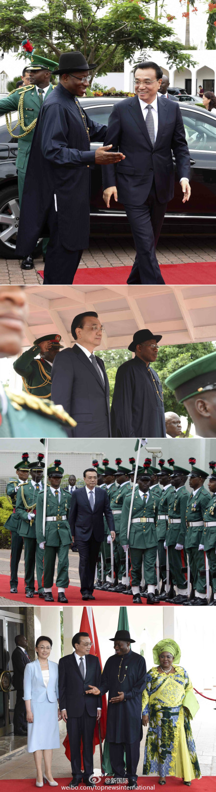 ??? 新華網北京5月7日電? 據新華社“新國際”微博報道,當地時間7日上午,尼日利亞總統喬納森在總統府為李克強總理舉行隆重歡迎儀式,現場鳴響禮炮,軍樂隊奏兩國國歌,李克強檢閱了儀仗隊。
