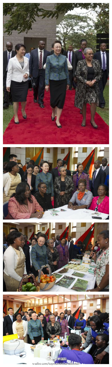 ????新華網北京5月11日電 據新華社“新國際”微博報道,10日,李克強總理夫人程虹在肯尼亞總統夫人和副總統夫人的陪同下參觀了快樂婦女組織。該組織用小額貸款支持農村婦女種植蔬菜、制作手工藝品等以提高家庭收入。程虹與受益于該組織的一些婦女交流,贊揚她們自食其力、補貼家用,還現場購買手工藝品以示支持。