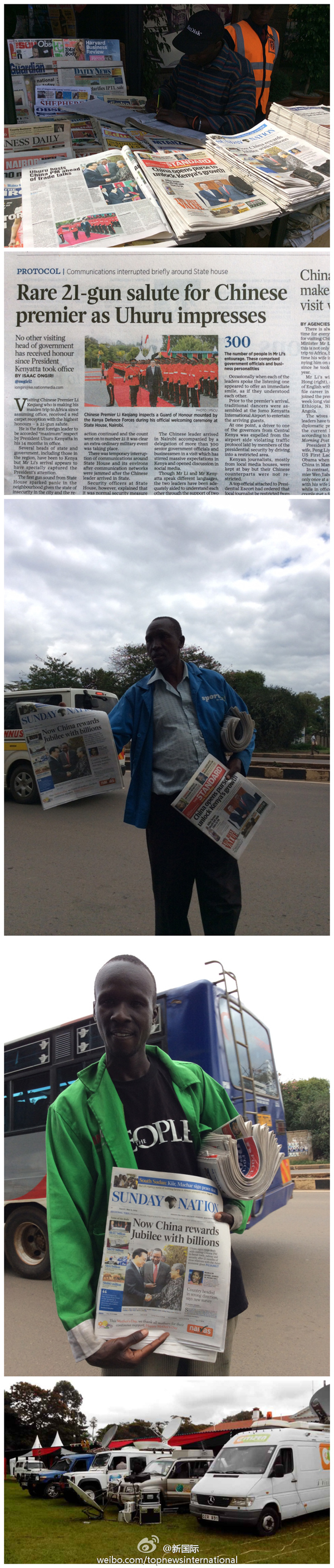 ????新華網北京5月11日電? 據新華社“新國際”微博報道,連日來,肯尼亞各大媒體紛紛對李克強總理訪肯進行全方位報道。主要報紙均在頭版頭條大篇幅介紹訪問情況,并開辟專版引述李總理講話對肯中關系進行述評。肯三大電視臺現場直播李總理和肯雅塔總統會見記者實況。肯媒體還高度評價中國在文化教育等領域的軟實力外交。