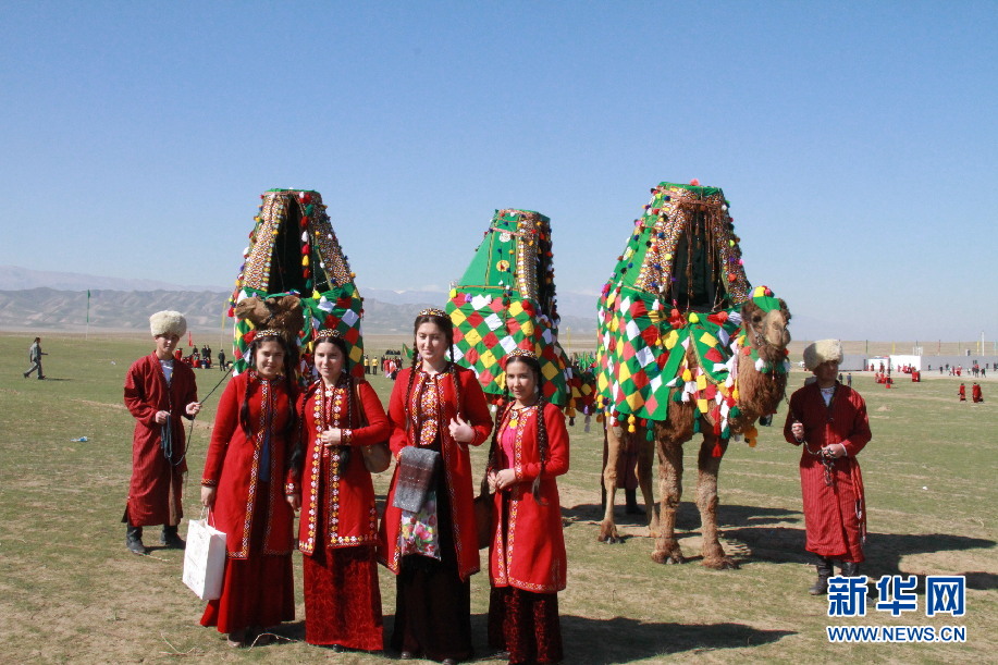 ????記者還看到過20來頭駱駝組成的駝群,其中頭駱身上綁著個布袋。駱駝低頭吃草,頭駝警覺地給它們站崗放哨。不一會兒,一些駱駝走到頭駝身前,向它施貼臉禮,頭駝一一回禮。當記者試圖靠近時,頭駝發(fā)出低沉的怪聲,群駝迅速抬起頭來,慢慢地朝遠方走去。在過節(jié)時,牧民小伙穿上紅色條狀長袍,頭戴白色羊羔皮帽,手牽的駱駝身上裹著人工織的毛毯,背上架著花轎,花轎中坐著美麗少女,少女頭戴小帽,梳著兩根長辮,身穿蓋過腳面的長裙。這是在給節(jié)日助興。同時,這也是土庫曼斯坦民族婚禮中迎娶新娘的一個縮影。在現(xiàn)實生活中,城市人很少見到駱駝。于是在各種活動中,跟打扮得如此漂亮的駱駝合影也是一件趣事。