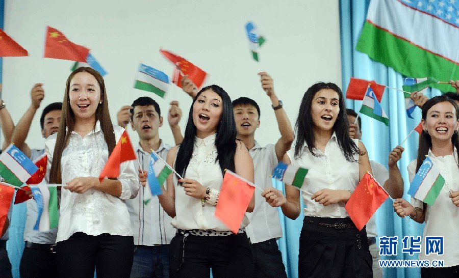 6月9日,學生代表在烏茲別克斯坦首都塔什干的烏世界語言大學禮堂表演節目。