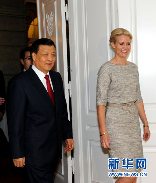 ??? 6月11日,正在丹麥進行正式訪問的中共中央政治局常委、中央書記處書記劉云山在哥本哈根會見丹麥首相、社民黨主席托寧-施密特。 新華社記者饒愛民 攝