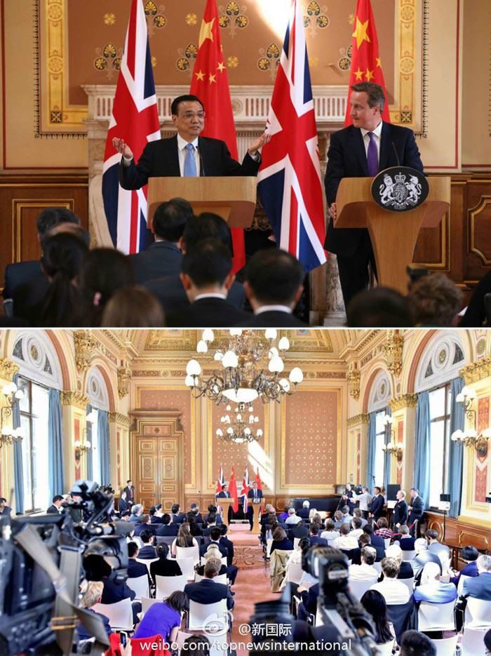 ???? 新華網北京6月18日電 據新華社“新國際”微博報道,17日李克強與卡梅倫共見記者時說,今天陽光明媚是個好日子,英國有句諺語:把握一個今天,勝似兩個明天。中國也常說“時不我待”。中英合作基礎好、潛力大,雙方有責任搶抓機遇,規劃新路線,鋪設快車道,使兩國關系明天更加燦爛。