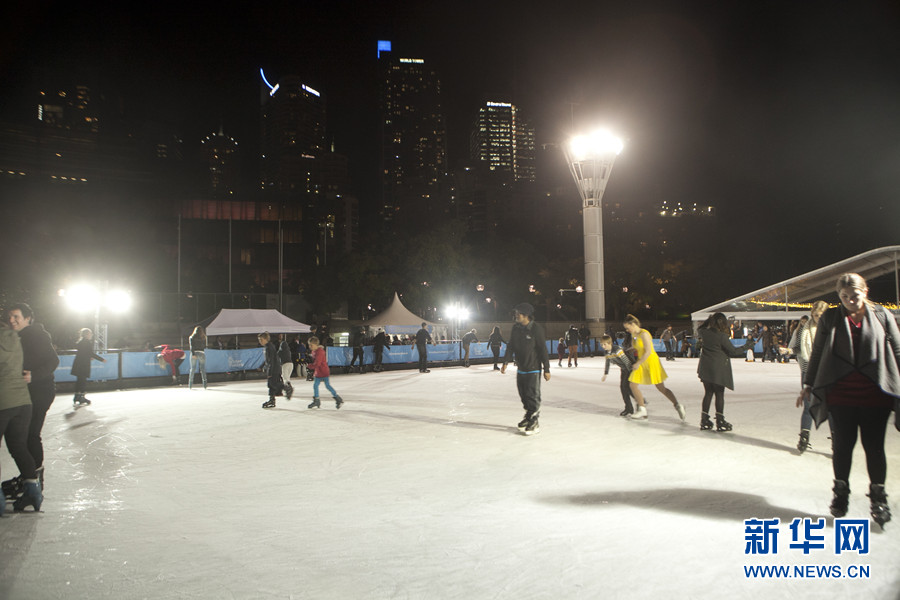 ????6月13日起,為期1個月的大型冬季冰雪活動在悉尼市中心的情人港(Darling Harbour)為悉尼市民冬季的生活增添了些許名副其實的冬季氣氛。圖為悉尼情人港塔巴隆公園(Tunmbalong Park)上,巨大的戶外滑冰場吸引了成千上萬名市民前來體驗。新華社記者 李冰 攝