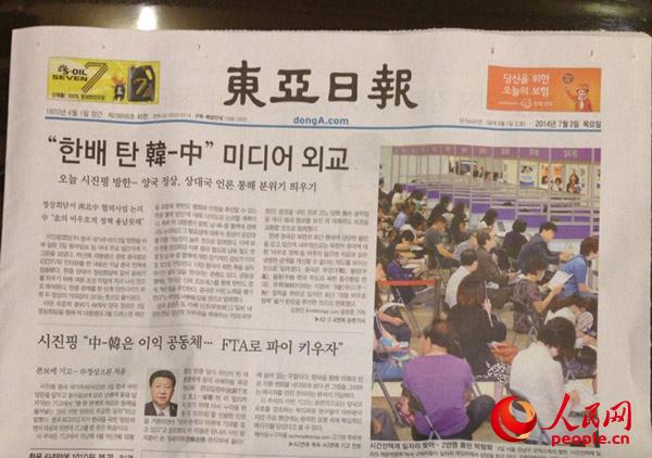 ??? 韓國《東亞日報》在頭版顯著位置刊發習近平主席署名文章《加快自貿區談判進程 做大利益蛋糕》金慧廷 攝