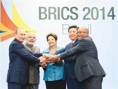 7月15日,習近平同出席會晤的巴西總統羅塞夫、俄羅斯總統普京、印度總理莫迪、南非總統祖馬合影。新華社記者 蘭紅光攝