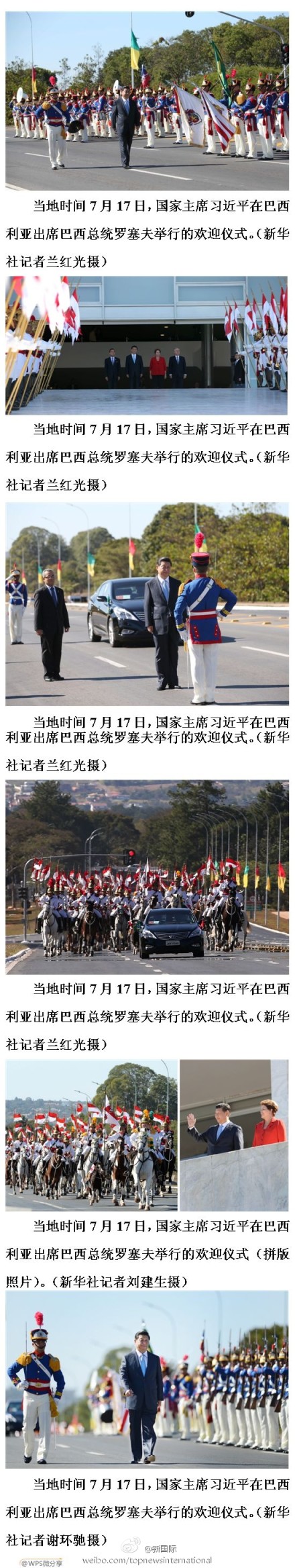????新華網(wǎng)北京7月18日電 據(jù)新華社“新國際”微博報道,17日,巴西總統(tǒng)羅塞夫?yàn)榱?xí)近平舉行隆重歡迎儀式。在總統(tǒng)府入口處,習(xí)近平與羅塞夫親切握手、問候。軍樂團(tuán)奏中巴國歌,升中國國旗,鳴禮炮21響。隨后,兩位元首一同登上觀禮臺,觀看儀仗隊分列式。騎兵馬隊簇?fù)碇娖欤简v跳躍,奮蹄疾馳。?