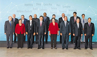? 當地時間7月17日下午,中國—拉美和加勒比國家領導人會晤在巴西利亞舉行。本次會晤由中方倡議,中國國家主席習近平、巴西總統(tǒng)羅塞夫、哥斯達黎加總統(tǒng)索利斯、古巴國務委員會主席兼部長會議主席勞爾·卡斯特羅、厄瓜多爾總統(tǒng)科雷亞、蘇里南總統(tǒng)鮑特塞、哥倫比亞總統(tǒng)桑托斯、智利總統(tǒng)巴切萊特、圭亞那總統(tǒng)拉莫塔爾、烏拉圭總統(tǒng)穆希卡、委內瑞拉總統(tǒng)馬杜羅、安提瓜和巴布達總理布朗等出席。
