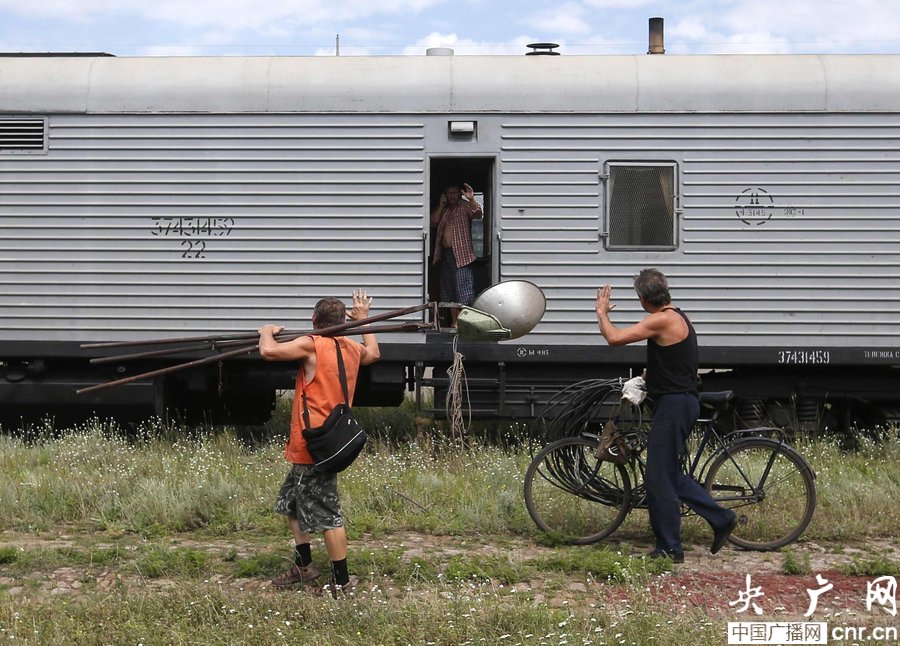 當地時間2014年7月20日,烏克蘭頓涅茨克Torez,馬航墜機遇難乘客遺體被裝上列車冷藏車廂將被運走。載有部分遺體的火車從距空難現場不遠的烏克蘭托列茲市出發,前往頓涅茨克市?;疖囯x站前,身處空難現場的歐洲安全與合作組織(歐安組織)代表檢查了運載遺體的5節冷藏車廂。