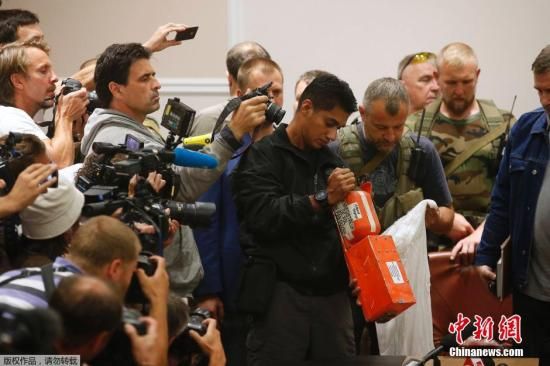 當(dāng)?shù)貢r(shí)間2014年7月22日,頓涅茨克,“頓涅茨克人民共和國(guó)”官員向馬來(lái)西亞調(diào)查人員移交馬航MH17航班客機(jī)黑匣子。