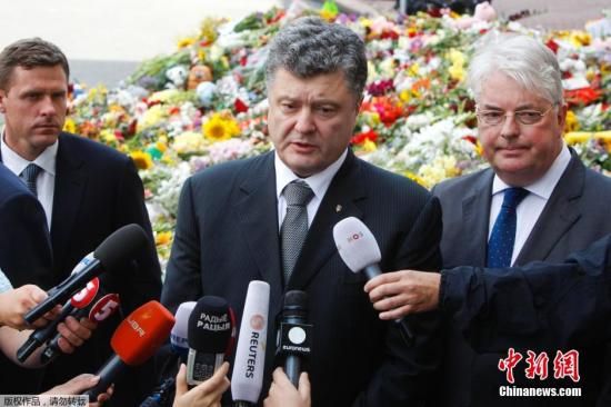 當(dāng)?shù)貢r(shí)間7月21日,烏克蘭基輔,烏克蘭總統(tǒng)波羅申科在荷蘭駐烏克蘭大使館外悼念馬航MH17遇難者。