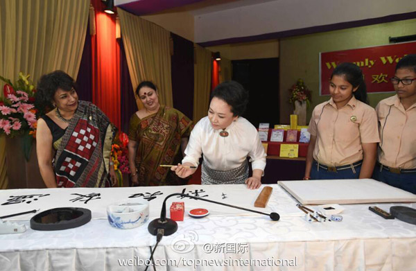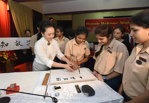 ????新華網北京9月18日電 據新華社“新國際”微博報道,習近平主席夫人彭麗媛18日上午在新德里參觀泰戈爾國際學校時,用毛筆書寫成語“溫故知新”,并簽名蓋上印章。她對師生們逐字講解后說,我們要經常溫習學過的知識,不斷學習掌握新知識,開拓創新,與時俱進。希望同學們認真學習,更好報效祖國,祝你們成功。