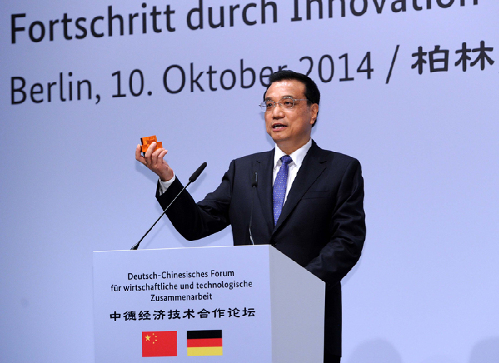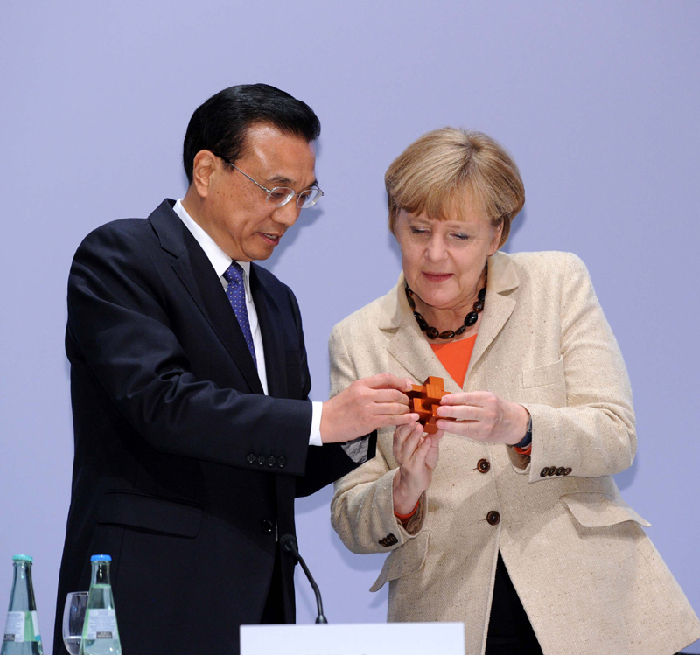 與默克爾共同出席第七屆中德經(jīng)濟技術(shù)合作論壇時,李克強在致辭最后提起,這次默克爾總理陪他逛了當?shù)匾患页校I了兩張明信片送給他的家人,而他也帶來一份禮物,是中國天津中德職業(yè)技術(shù)學(xué)院學(xué)生的作品,學(xué)生們希望他在公開的場合把這個禮物送給默克爾,以表達對中德制造業(yè)深度融合的期待。