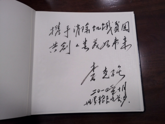 ????石板前面擺放著一張簽字桌,桌上放著一本叫做golden book(金書)的簽到簿,是專供到訪的國家領導人用的??藦娍偫碓谏厦鎸懴铝诉@樣一句話“攜手消除饑餓貧困 共創人類美好未來”。