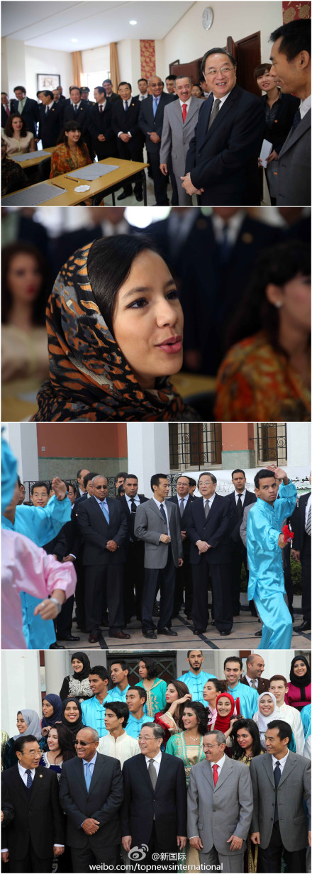 ??? 新華網(wǎng)北京11月6日電 據(jù)新華社“新國際”微博報(bào)道,全國政協(xié)主席俞正聲5日參觀摩洛哥穆罕默德五世大學(xué)孔子學(xué)院,身著摩中兩國民族服裝的當(dāng)?shù)貙W(xué)生誦唐詩、打太極、跳《小蘋果》歡迎。俞正聲走進(jìn)課堂對學(xué)生說:“你們是中摩友好的未來。希望大家用心學(xué)好中文,促進(jìn)合作交流。” (記者李拯宇 攝影劉衛(wèi)兵)