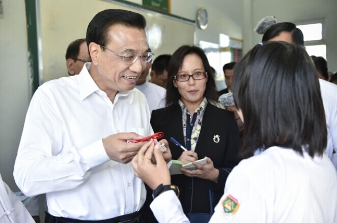 11月14日,克強總理來到內(nèi)比都第十四中學(xué)與青少年們交流。