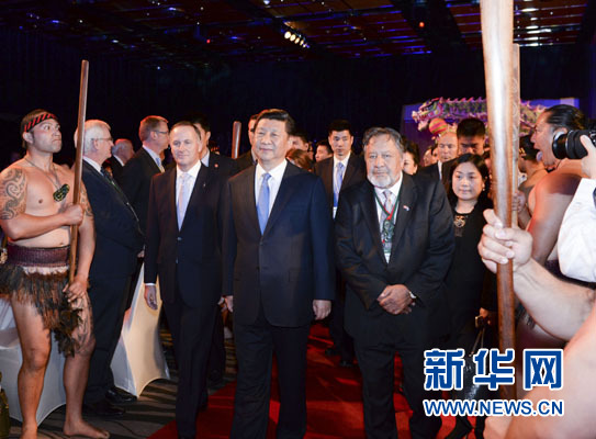 ????習(xí)近平和夫人彭麗媛抵達時,新西蘭總理約翰·基夫婦迎接,毛利族代表以傳統(tǒng)方式歡迎。在毛利族勇士和中國舞龍引領(lǐng)下,習(xí)近平和彭麗媛步入大廳,全場起立鼓掌。毛利族青年用歌聲表達喜悅和友誼。