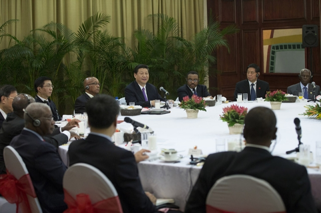 ????(2013年3月28日,國家主席習近平在南非德班同非洲國家領導人舉行早餐會。新華社記者蘭紅光攝)