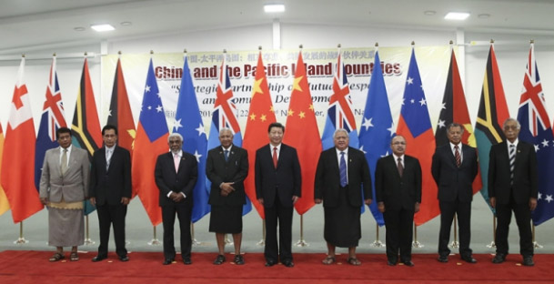 ????當(dāng)?shù)貢r間下午近6點,習(xí)主席在國旗前迎候8個太平洋島國的領(lǐng)導(dǎo)人,與他們一一握手,然后請大家站在一起合影。“咔嚓”聲四起,中國和太平洋島國關(guān)系史上具有歷史意義的瞬間,就此定格。