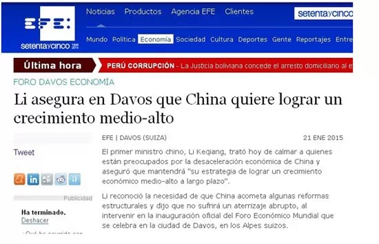 22日,西班牙埃菲社報道了李克強總理在達沃斯世界經濟論壇上的致辭,特別提到他就中國經濟增速放緩的回應。報道中引用李克強總理的話:“中國經濟進入新常態,經濟由高速增長轉為中高速增長。發展則必須由中低端水平邁向中高端水平,為此要堅定不移地推動結構性改革?!?/p>