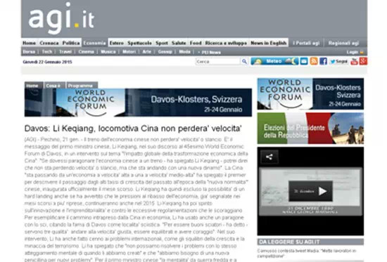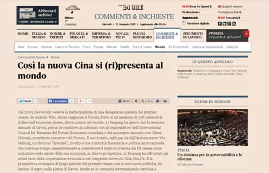 意大利24小時太陽報1月22日發表題為《中國重新向世界自我介紹》的評論性文章,介紹了李克強在世界經濟論壇上的講話。文章稱,雖然國際社會一直在用西方國家的種族主義中心心態以及舊的眼光看待中國,中國國務院總理李克強的長期戰略眼光和他的新政策還是給達沃斯的聽眾們留下深刻印象。