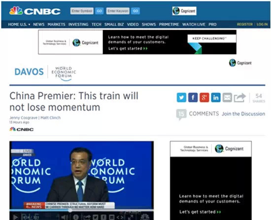 其中,美國CNBC新聞臺1月22日刊文,以“火車動能不減”為題,形容李克強總理提到的不會“硬著陸”的中國經濟。李克強總理在致辭中以列車形容中國經濟“新常態”,指出,中國經濟的列車不會因“有所放緩而失速,反而會跑得更穩健”。文中還援引李克強在會上的發言,指出中國將“堅定不移地推動結構性改革”,推動自貿區、國際間經濟合作的建設與發展。