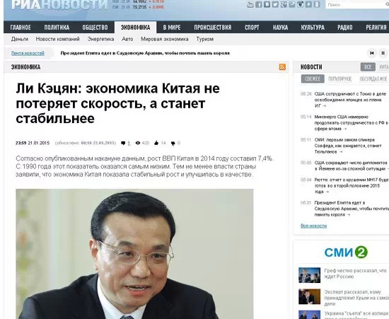 俄新社以一篇題為《中國經濟不會失速,而會更加穩定》的文章,報道了中國經濟的發展前景。文中稱,2014年中國經濟發展速度是7.4%,這是1990年以來的一個低點,但中國經濟的發展正在體現“新常態”,即體現在質的提升。