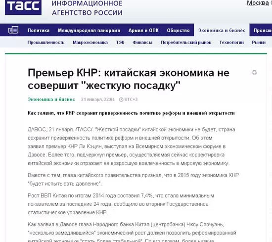 塔斯社發表了一篇名為《中國總理:中國經濟不會硬著陸》的文章。文中指出,李克強和中國央行行長周小川在達沃斯論壇期間均表示,中國將深化改革開放,漸緩的增長速度有利于中國經濟的轉型。在3月份舉行的中國兩會上,中國政府將提出新的經濟發展規劃,速度肯定不會是北京追求的首要目標。