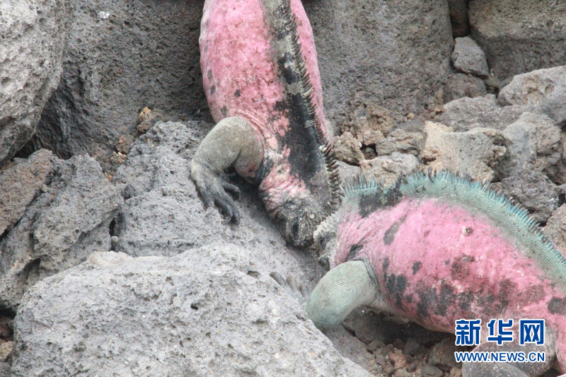 兩只佛羅雷阿納島上的海鬣蜥在爭奪地盤。到了繁殖期的海鬣蜥皮膚會(huì)呈現(xiàn)出大紅大綠的顏色,情緒也會(huì)高漲起來。