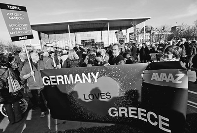 為彌合在希臘債務問題上的分歧,德國總理默克爾3月23日在柏林與到訪的希臘總理齊普拉斯會談。圖為當天在德國柏林,有示威者打出“德國愛希臘”的標語,呼吁雙方盡快達成共識。人民視覺