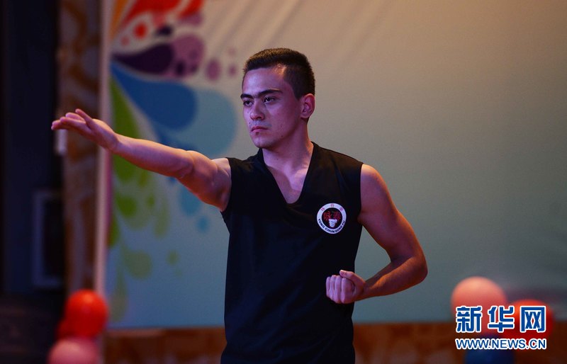 4月28日,在烏內務部文化宮禮堂,來自烏茲別克斯坦世界語言大學的DJAVDAT(中文名:張睿)在參加比賽。新華網(wǎng)記者 沙達提攝