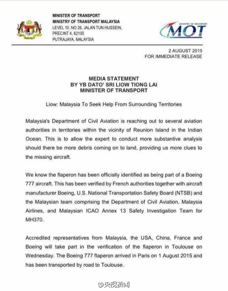 據(jù)“央視新聞”微博報(bào)道,今天(8月2日)馬來(lái)西亞交通部發(fā)表官方聲明,證實(shí)此前在法屬留尼汪島發(fā)現(xiàn)的飛機(jī)機(jī)翼殘骸屬波音777客機(jī)。馬來(lái)西亞、美國(guó)、中國(guó)、法國(guó)、波音公司組成的鑒定團(tuán)隊(duì),將于8月5日在法國(guó)圖盧茲參加鑒定工作,以確認(rèn)殘骸是否屬于MH370。(央視記者朱雪松吳小望)