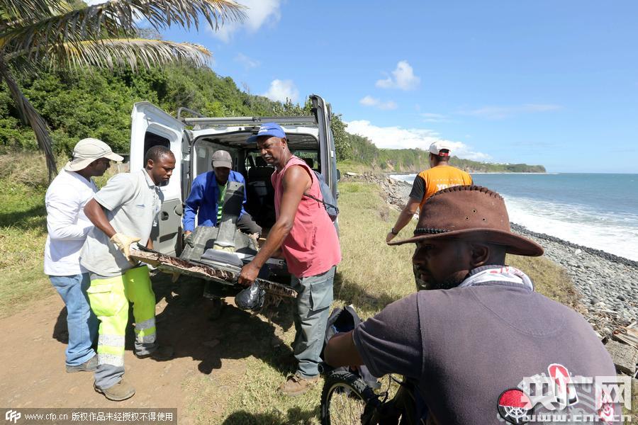 當地時間2015年8月11日,法屬留尼汪島,當地搜救隊獲得的馬航MH370殘骸。