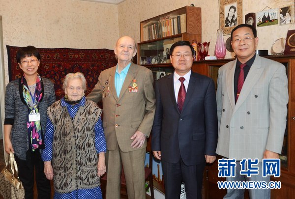 91歲的扎波洛夫老人身體健碩,思維靈活。他向孫大使展示自己的戰爭獎章、在中國的老照片和關于所在部隊的書籍;講述自己參與解放中國東北的戰斗故事,回憶在旅順、大連培訓中國機槍手、教孩子們彈鋼琴的經歷。戰斗的殘酷、友誼的溫馨,讓他心情澎湃,說到動情處,老人熱淚盈眶。他表示,非常高興看到中國取得偉大的發展成就。希望中烏兩國世代友好下去,兩國人民永遠做好朋友。