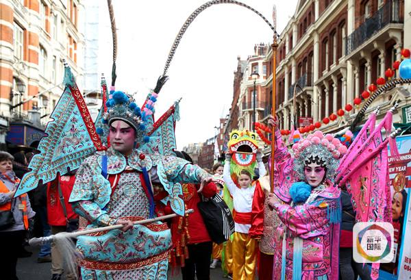 ????2015年2月22日,身穿京劇服裝的演員參加在英國倫敦舉行的新春花車巡游,慶祝中國農歷羊年春節。