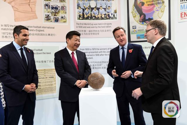 10月23日,國家主席習近平在英國首相卡梅倫陪同下,參觀曼徹斯特城市足球學院。新華社記者 饒愛民 攝
