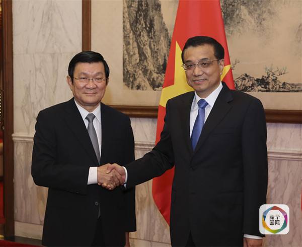 2013年6月20日,國(guó)務(wù)院總理李克強(qiáng)在北京釣魚臺(tái)國(guó)賓館會(huì)見越南國(guó)家主席張晉創(chuàng)。