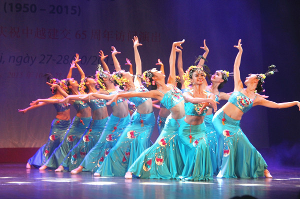 2015年10月27日,中國(guó)云南省藝術(shù)團(tuán)在越南首都河內(nèi)表演傣族舞蹈《美的祝福》,慶祝中越建交65周年。