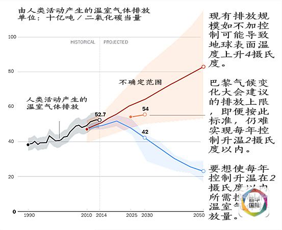 根據聯合國環境規劃署和世界資源研究所等機構的數據,全球由人類活動引發的溫室氣體排放量呈上升趨勢,2012年接近500億噸二氧化碳當量,2014年達到527億噸二氧化碳當量。