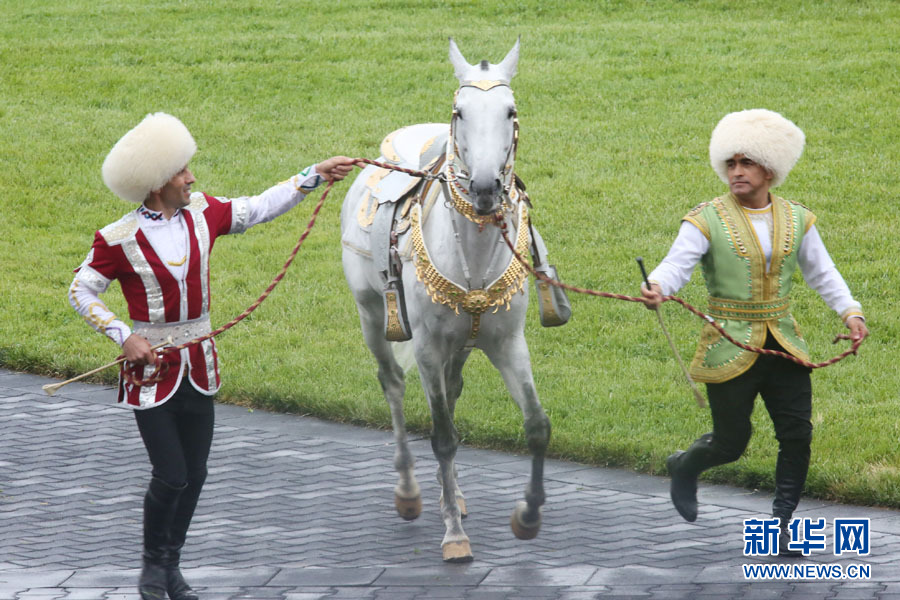 當日,土庫曼斯坦為慶祝阿哈爾捷金馬(中國稱汗血馬)節在總統馬場舉行汗血馬選美大賽。一匹名為“別格汗”的8歲鼠灰色馬受到評委們的青睞,贏得2016年度“最美汗血馬”稱號。新華網記者 盧敬利 攝