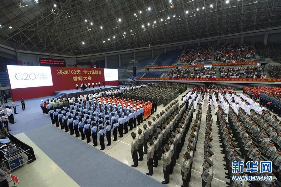 ??? 5月27日,駐杭部隊官兵、武警官兵、公安干警、志愿者、醫護人員、賓館保障人員及各界代表參加誓師大會。 當日,“決戰100天全力保峰會”迎接G20誓師大會在浙江杭州舉行。 新華社記者黃宗治攝