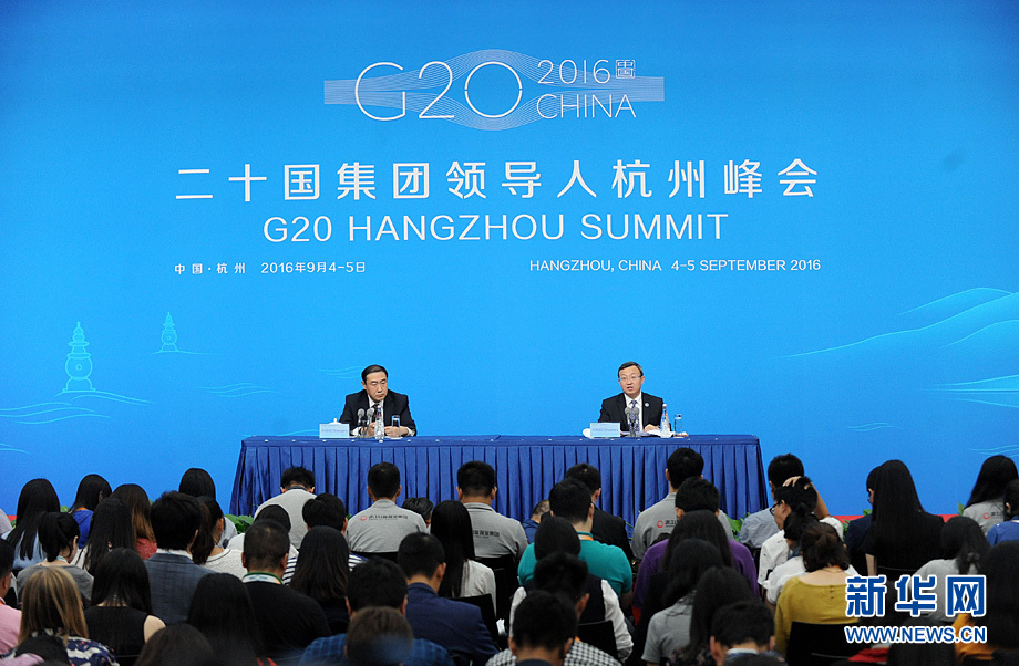 9月3日,中國代表團在浙江杭州舉行新聞發布會,商務部副部長王受文就G20杭州峰會經貿成果展望向記者介紹情況并回答提問。新華網記者?陳競超 攝