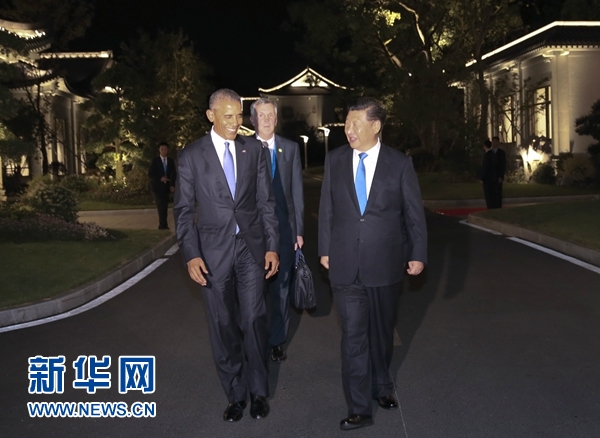 9月3日晚,國家主席習近平在杭州西湖國賓館與前來出席二十國集團領導人杭州峰會的美國總統奧巴馬交談。 新華社記者 蘭紅光 攝